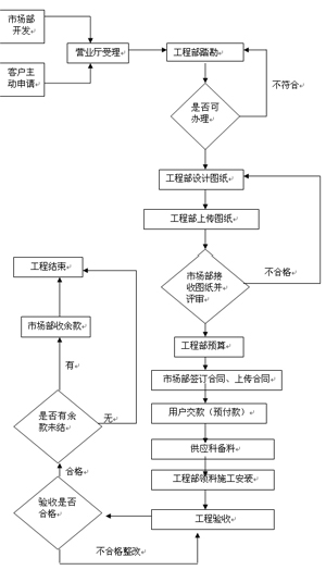 市場部:主要負(fù)責(zé)開發(fā)新用戶,負(fù)責(zé)簽定費(fèi)用合同,和用戶協(xié)商施工中遇到的問題.